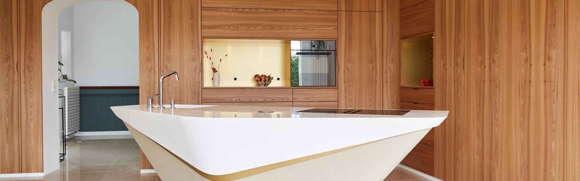 This kitchen is also remarkable for the top quality materials used throughout, materials which work together to perfection: the cupboard carcasses are in natural American walnut, the fronts, which were hand-made in the workshop, are in elm veneer and there are box-jointed drawers in solid walnut. The island and open niche work surfaces are in HIMACS, with details in a metallic finish. The recessed handles were designed to blend with the veining of the material.