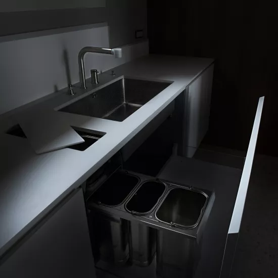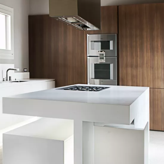 HIMACS est en train de devenir le matériau idéal pour le secteur du design d'intérieur, grâce non seulement à sa résistance, mais aussi à son aspect délicat pour la finition de chaque angle et chaque courbe qu'il dessine. La cuisine aux lignes minimalistes réalisée par Simone Piva rassemble toutes ces caractéristiques et se combine parfaitement à d'autres matériaux, grâce à sa blancheur élégante et éclatante.