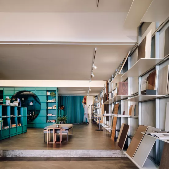 Tous les espaces sont organisés autour d’une serpentine en HIMACS, dans la teinte Evergreen, dont les lignes et les courbes courent sur toute la longueur du showroom. Cet agencement cloisonne l’espace en zones clairement différenciées, qui peuvent être utilisées comme espaces de réunion ou comme mini-salles d'exposition. Exploitant toute la longueur du bâtiment, ce fil conducteur rationalise l’espace tout en permettant une disposition optimale des grands présentoirs.
