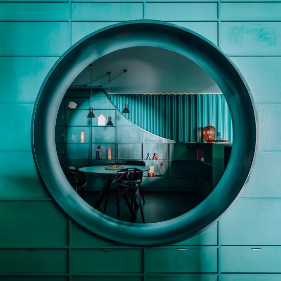 Les larges entrées circulaires sont associées à un mobilier aux lignes géométriques, à l'image d'une grande grille, le tout décliné dans une couleur bleu pétrole intense, dont le design curviligne est permis grâce aux excellentes propriétés thermoformables de HIMACS. Cette pierre acrylique excelle par rapport aux autres matériaux grâce à ses capacités thermoplastiques qui lui permettent d'être moulé dans n'importe quelle forme sans compromettre la couleur.
