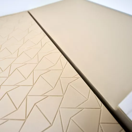 L'intérieur du RoadXplorer ressemble davantage à une maison qu'à un camping-car. Le plancher sert de cadre, un motif CNC visuellement sans fin étant fraisé dans le matériau HIMACS. HIMACS n'est pas seulement parfait pour le chauffage par le sol, il est aussi facile à nettoyer, robuste et résistant à l'eau, au gel et aux UV. Le ton chaud HIMACS Babylon Beige rayonne d'une harmonie sereine. Le sol s'étend de l'entrée à la salle de bains en passant par la salle à manger, le tout d'un seul tenant. Le motif créatif en forme de diamant n'est pas seulement attrayant sur le plan visuel, il est aussi pratique, car il offre une meilleure résistance au glissement.