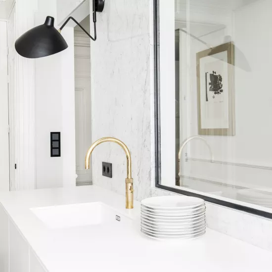 Afin d’apporter une note de couleur à l’espace, Sander van Eyck a créé un contraste avec les robinets en cuivre qui s’accordent avec la hotte aspirante. L’architecte a choisi de la concevoir en laiton massif de façon artisanale et de la fixer sur un mur en marbre de Carrare, conférant à la pièce, toujours avec beaucoup d’élégance, une touche d’originalité.