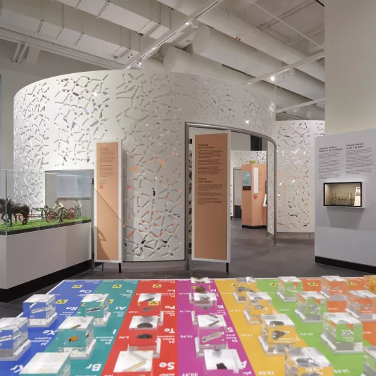 The newly designed chemistry exhibition is divided into three large sections, starting with historical laboratories from the Middle Ages, followed by an experimentation area with a hands-on lab and auditorium. The third section comprises a large exhibition hall with visually engaging stations that demonstrate the importance of chemistry in everyday life; from cosmetics and nutrition, to leisure, sport and construction.